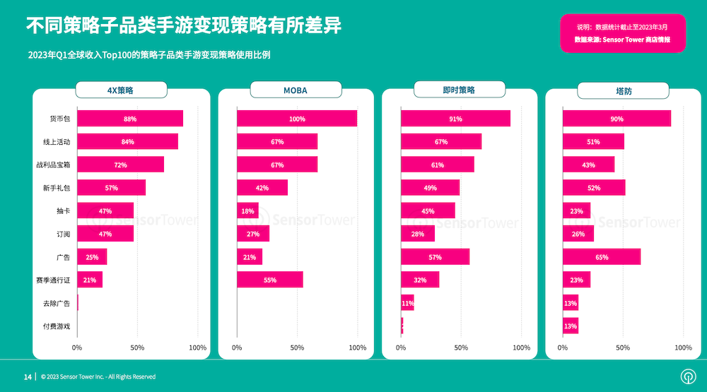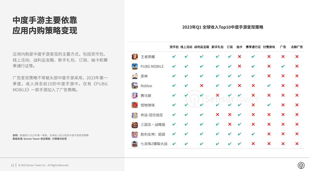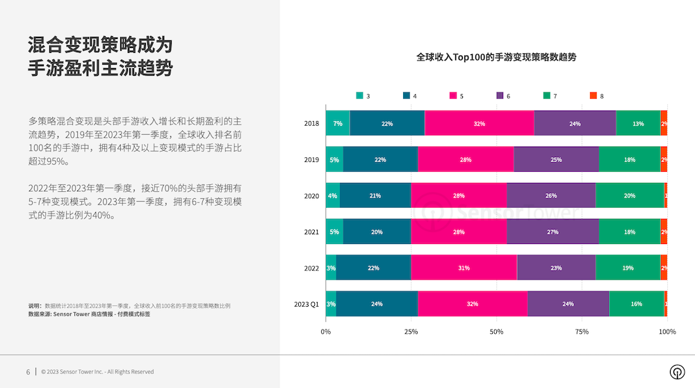 依据Sensor Tower发布的《2023年全球手游变现趋势洞悉》,多战略混合变现成为全球头部手游收入增加和长时间盈余的干流趋势,2023年第一季度,全球收入排名前100名的手游中,具有4种及以上变现形式的手游份额为97%。以下为陈述内容: