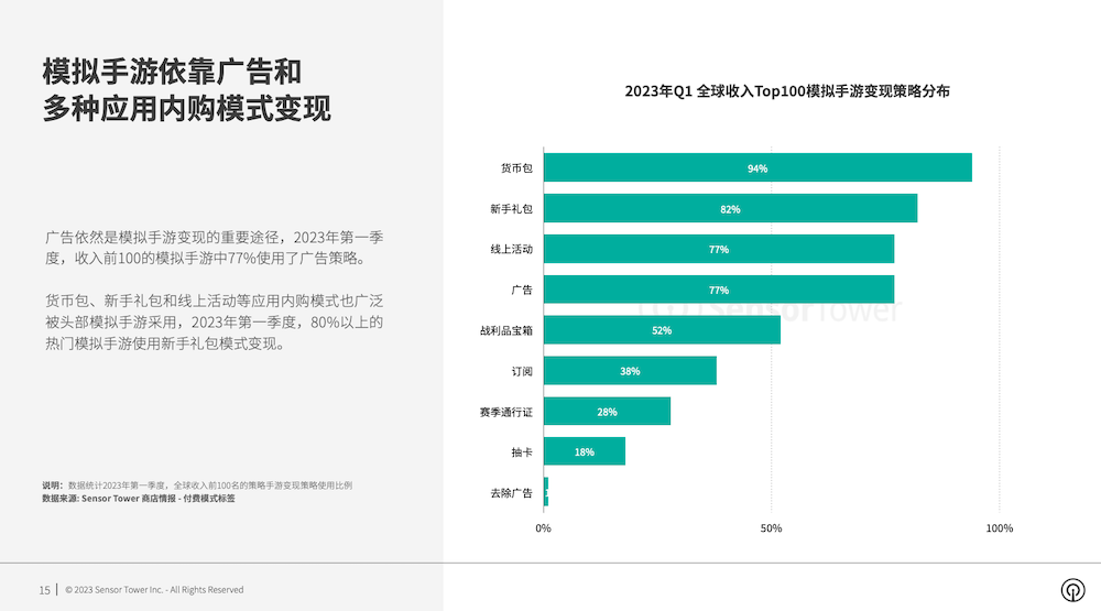 广告依然是模仿手游变现的重要途径,2023年第一季度,收入前100的模仿手游中77%运用了广告战略。钱银包、新手礼包和线上活动等运用内购形式也广泛被头部模仿手游选用。
