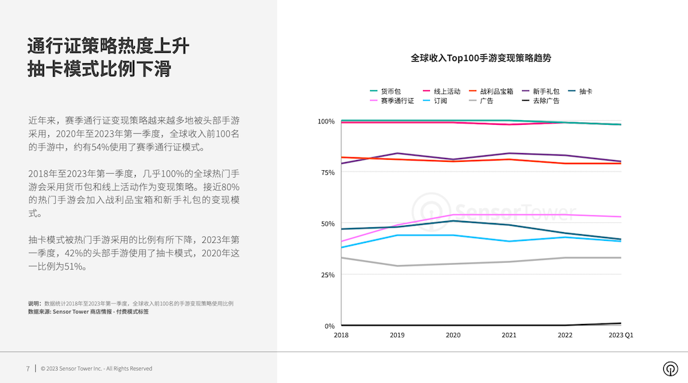 近年来,越来越多的头部手游选用赛季通行证形式变现,2023年第一季度,全球收入前100名的手游中,约有54%运用了该形式。