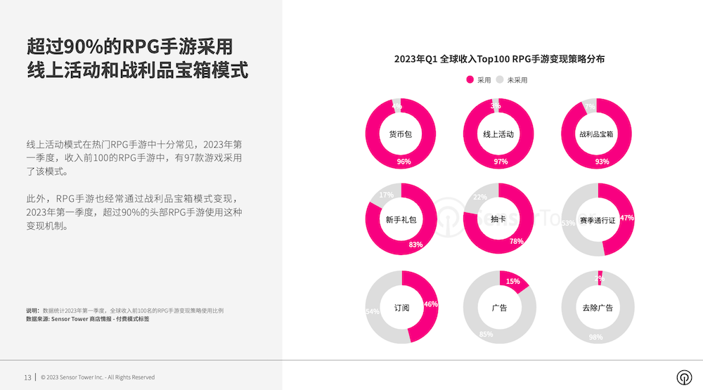 RPG手游非常重视线上活动的运营,2023年第一季度全球收入前100的RPG手游中,有97款游戏经过线上活动形式变现。一起,战利品宝箱变现战略也经常被抢手RPG手游运用。