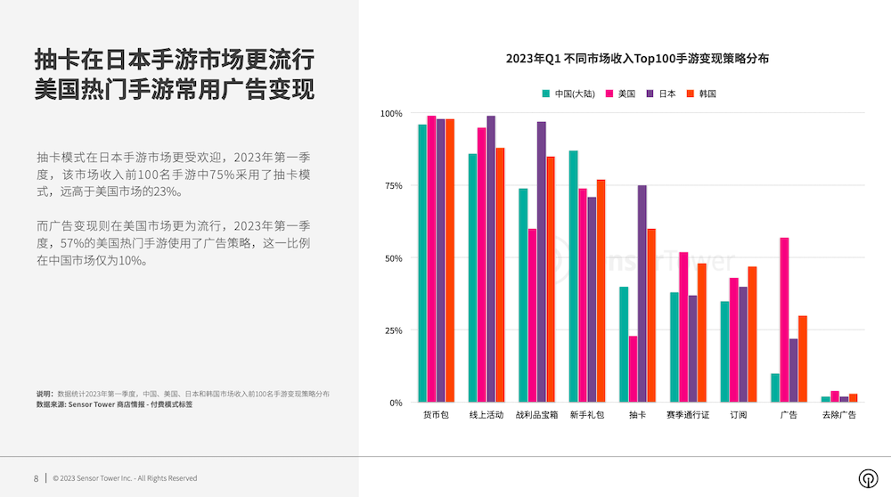 不同商场头部手游变现战略有所差异,其间抽卡形式在日本手游商场更受欢迎,而广告变现则在美国商场更为盛行。