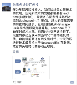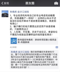 朱啸虎在争辩中以同享单车为例说,同享单车使得我国中心城区轿车加油量下降 5%,没有哪个 ICO 项目有这样的社会实在价值。这条朋友圈正文加上他自己的谈论,总共用了六个感叹号,用于加强口气。但他没有在论说时提到自己从前的得意之作ofo。